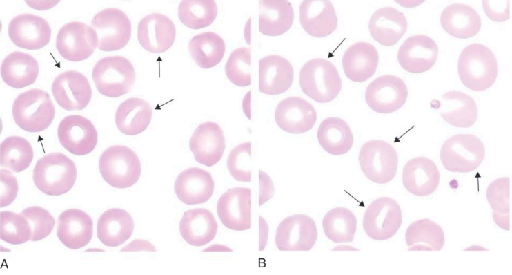 Stomatocytes are blood cells characterized by a central linear slit or stoma seen on stained blood films. Under scanning electron microscopy or in wet preparations, they exhibit a cup- or bowl-shaped appearance. Factors such as low pH or exposure to lipid-soluble drugs like chlorpromazine can induce stomatocyte formation, which is typically reversible. The condition is often associated with various membrane abnormalities, possibly involving the expansion of the inner leaflet of the red cell membrane. Stomatocyte formation has been observed in liver disease, hereditary spherocytosis, and autoimmune hemolytic anemia, among other conditions. Notably, alcohol excess and alcoholic liver disease are common causes, often accompanied by macrocytosis. Inherited disorders like hereditary stomatocytosis and hereditary xerocytosis are characterized by the presence of stomatocytes. Furthermore, certain Mediterranean populations may exhibit a condition known as Mediterranean stomatocytosis/macrothrombocytopenia, linked to hereditary phytosterolemia. Stomatocytes have also been associated with conditions such as analphalipoproteinemia (Tangier disease) and hypoalphalipoproteinemia (Bain,2015)