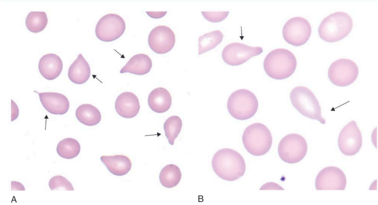"Teardrop" or pear-shaped cells (dacrocytes) occur when there is bone marrow fibrosis or severe dyserythropoiesis and also in some types of hemolytic anemias. They are particularly characteristic of megaloblastic anemia, thalassemia major, and myelofibrosis - either primary myelofibrosis or myelofibrosis secondary to metastatic carcinoma or other bone marrow infiltration. In both thalassemia major and primary myelofibrosis, the proportion of teardrop cells decreases following splenectomy, suggesting either that they are the product of extramedullary hematopoiesis or that they are formed when the spleen causes further damage to abnormal red cells. Teardrop cells that are present in occasional cases of autoimmune hemolytic anemia, Heinz body hemolytic anemia, and β-thalassemia major are likely to be the result of the action of splenic macrophages on abnormal erythrocytes, resulting in the removal of part of the red cell, Heinz bodies, or α chain precipitates. Teardrop poikilocytes are common in patients with erythroleukemia (Bain,2015)